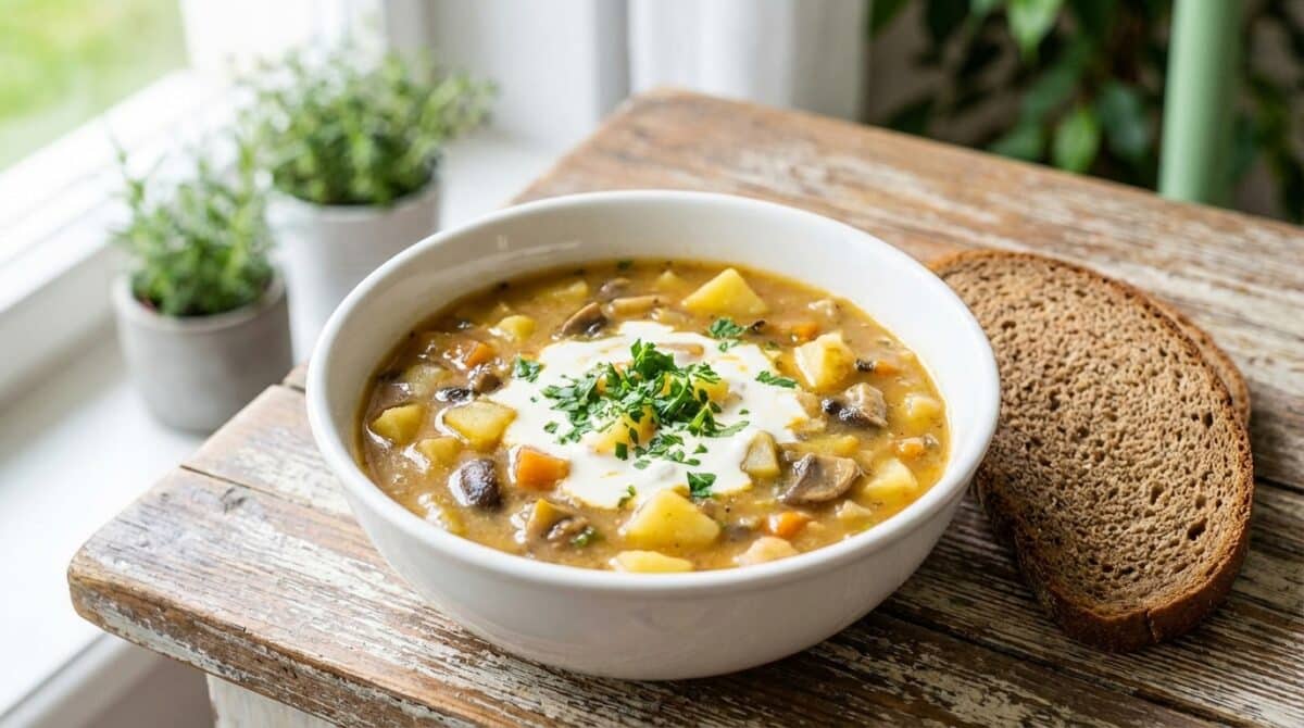 S houbami: Přidejte hrst sušených hub namočených předem (i s trochou nálevu) nebo čerstvé žampiony opečené na másle. Chuť se posune směrem k bramboračce, ale pořád zůstane rychlá.